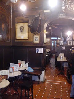 Al pasar a su interior, nos da la sensación de haber retrocedido varios siglos, Una pequeña barra de zinc, material inoxidable de la época, rematada en su extremo final por una antiguo grifo que merece estar en un museo. Mantiene una instalación de luz de gas.Suelos de baldosa de barro rojo cocido y tacos blancos, y paredes con arrimadero de madera a media altura.