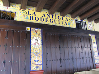 Decíamos que la entrada se halla bajo unos soportales, que nos proporcionan una zona exterior muy buena para tomar la cervecita fuera. Si ponemos los toldos extendidos, esta zona en sombra es aún mayor, y protege del sol en loas meses cálidos, que en Sevilla son muchos. Pero aún es mejor cuando nos guarecemos en esta zona de la lluvia, pues ya sabemos, como nos dicen en la célebre obra teatral "Pigmalión", o en su versión musical "My Fair Lady", que "la lluvia en Sevilla en una pura maravilla" Esta frase corresponde a una escena en la que un refinado profesor enseña declamación a la bella joven para hacerla una persona culta e ilustrada. Cada vez son más necesarios Pigmaliones para intentar suavizar, si es que eso es posible, la atronadora vulgaridad y mala educación de buena parte de la actual sociedad, por no hablar de su miseria intelectual.